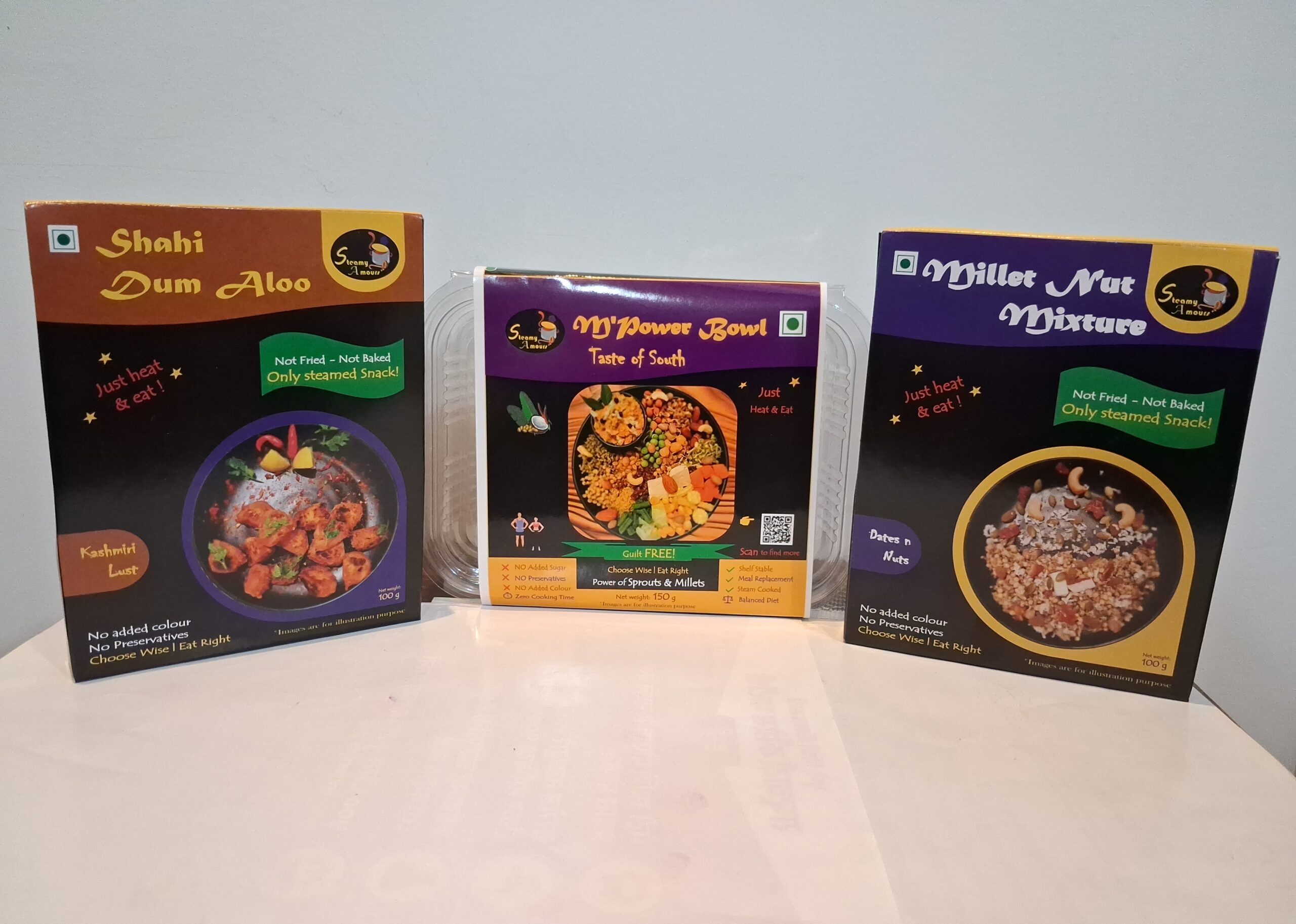 Calories: 224 Kcal per 100 g for M’Power Bowl, 204 Kcal For Millet-Nut Mixture and 50 Kcal for Shahi Dum Aloo